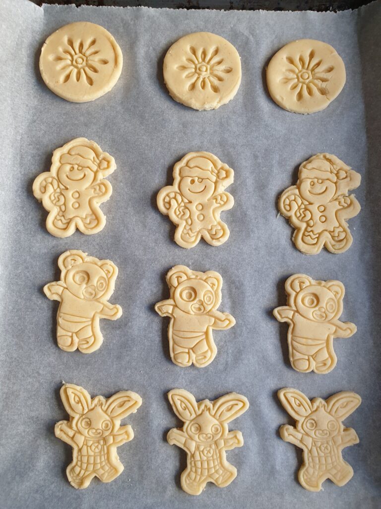 A hozzávalókból tésztát gyúrunk, ha a margarin miatt ragacsos lenne, kicsit hűtőben pihentetjük. Ezután rizslisztezett felületen kinyújtjuk, szaggatjuk, nyomdázzuk, papírral bélelt sütőlapra sorakoztatjuk őket. 170 fokon 12-15 percig sütjük, majd a lapon kihűtjük. Mikor kihűlt, lehet tányérra rakosgatni, különben törhet.
