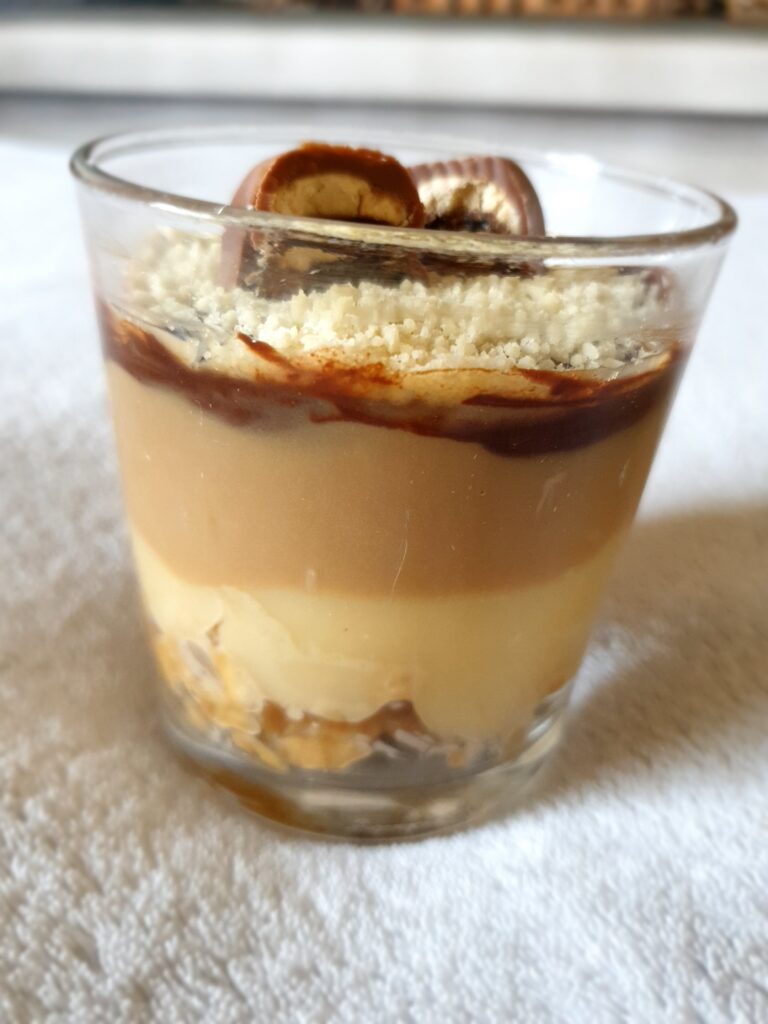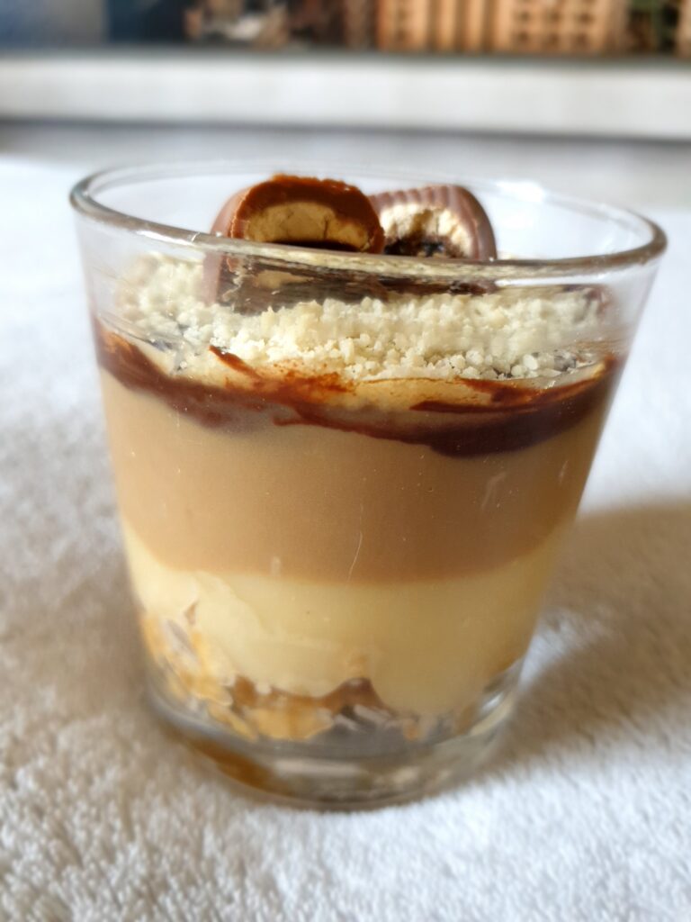 Rétegezzük kelyhekbe: alulra a mogyoróvajas rizspufi, rá az egyik pudingréteg, majd a másik, ezután az olvasztott csoki és a díszítés. 🙂 Egyszerű és nagyszerű.